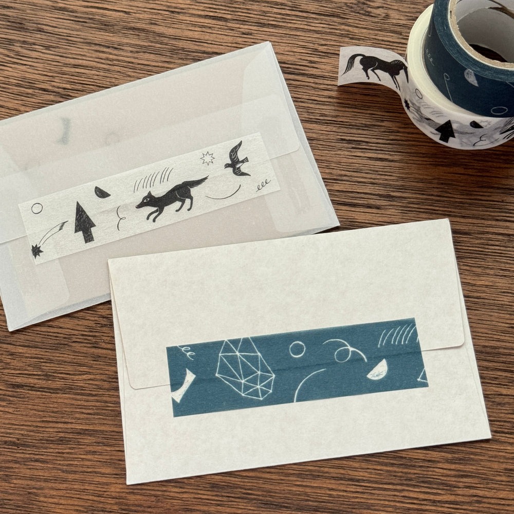 西淑さんの描く夜に集う動物たちが幻想的なモノトーンのマスキングテープです。シックで大人っぽい雰囲気は、お手紙の封緘やジャーナリングのアクセントにと活躍しそうです。