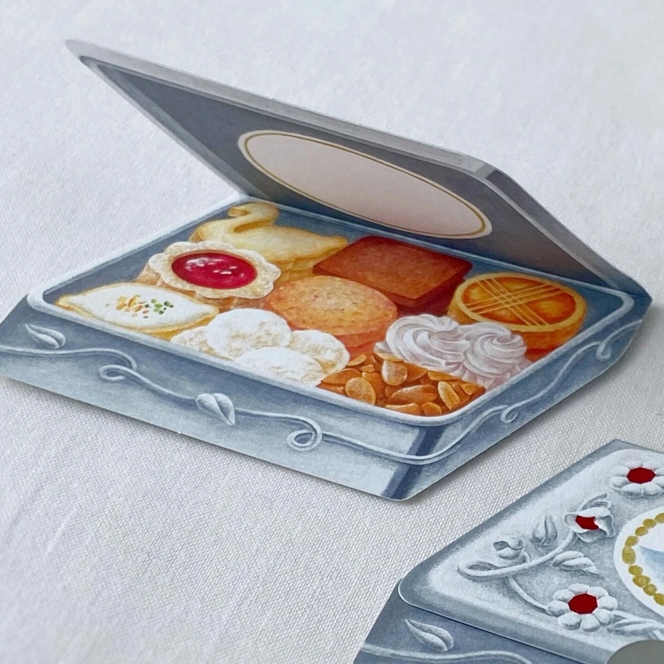 ミニカードは折り畳むだけでクッキー缶を閉じた時のような立体に見えるイラストと構造になっています。