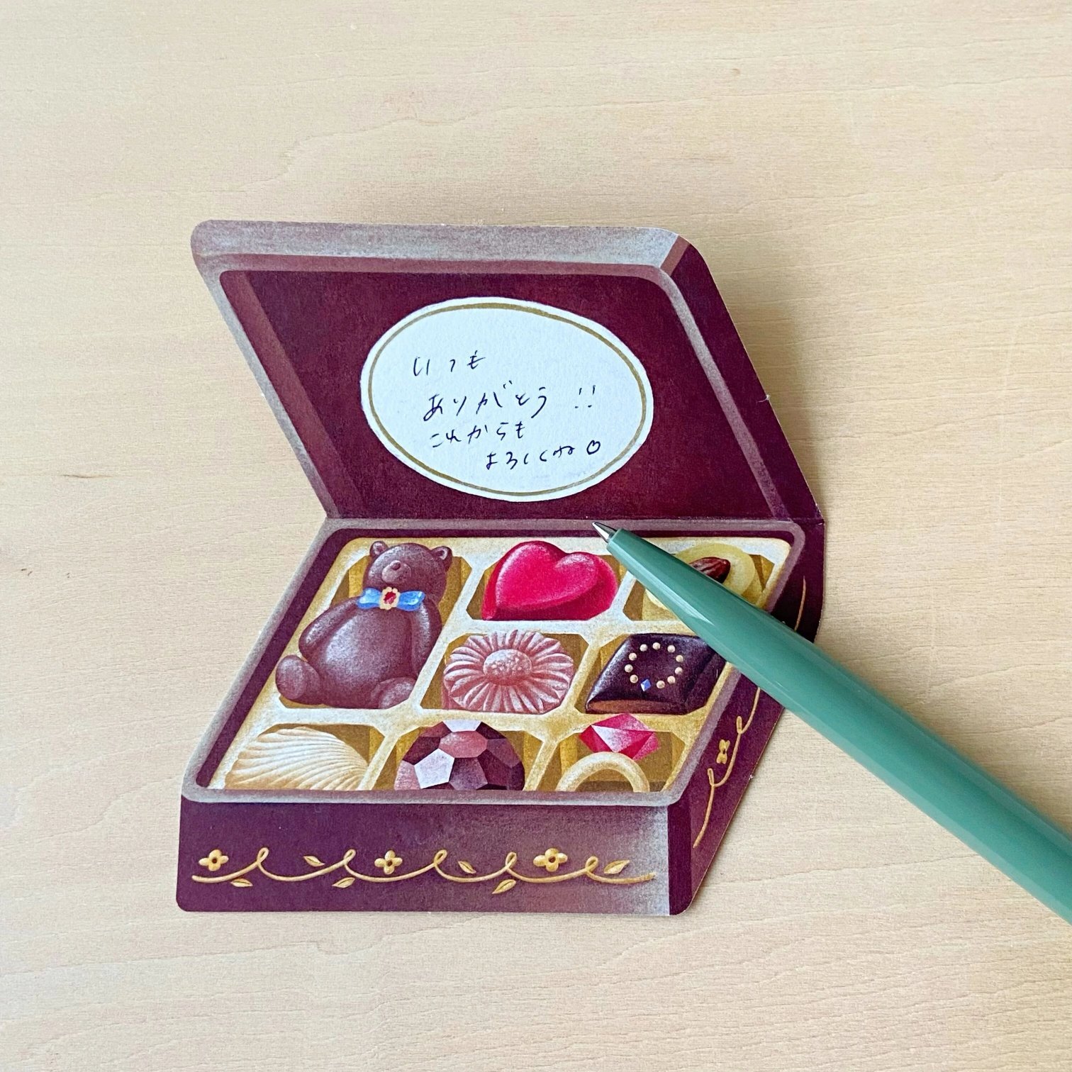 ミニカードは折り畳むだけでチョコレート缶を閉じた時のような立体に見えるイラストと構造になっています。