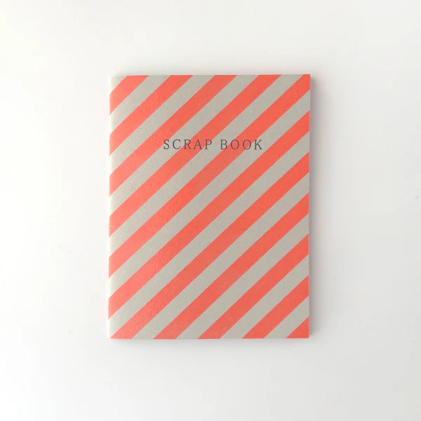 素材の異なる様々な紙を綴じ込んだA5サイズより少し小さなスクラップブック。元気な色のストライプ柄が表紙です。パリパリした紙、ざらざらした紙、透明な紙、無地に罫線など、さまざまな紙を綴じた書くのが楽しくなるノートです。ジャーナリングやコラージュにも活躍しそうです。